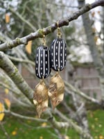 Each clay pendant measures approximately 1.5cm wide and 3cm long, with two drop lengths. Design One hangs around 8cm from the ear, while Design Two drops approximately 7cm.
